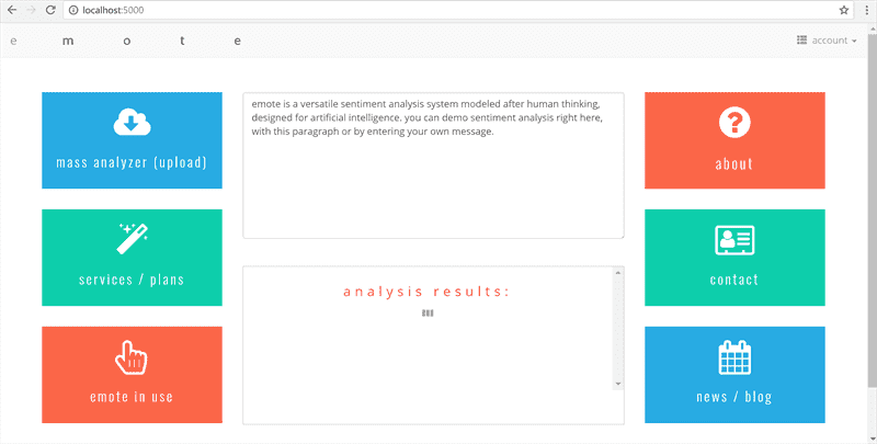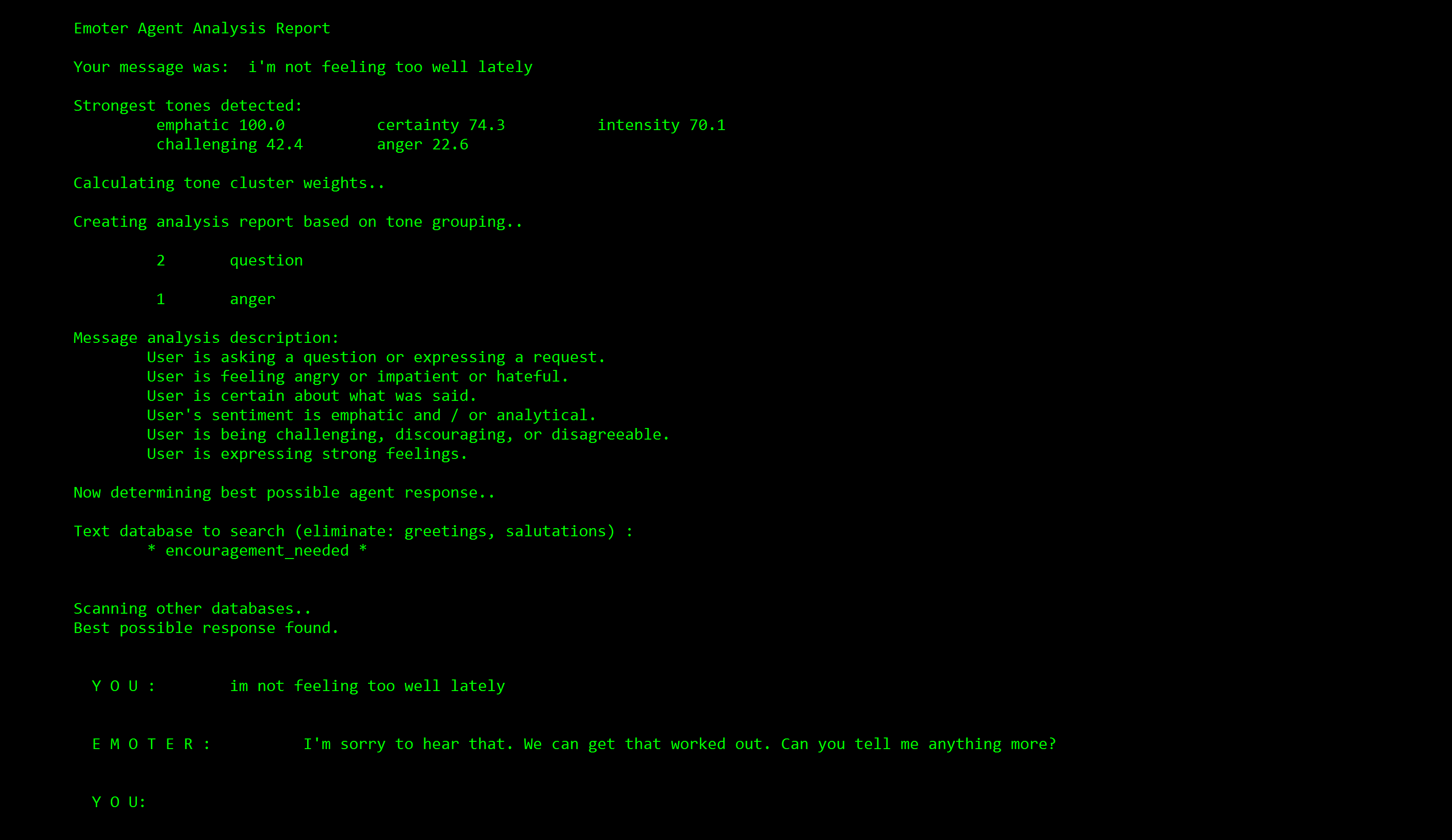 Emote was written in Python and uses the TextBlob / NLTK, NumPy, pandas, and scikit-learn libraries to build a probabilistic sentiment analyzer for 26 different classifications. These classifications have been divided into 13 pairs of opposites, and are designed to be grouped together to create tone clusters that can then encompass more values as well as decrease false positives.