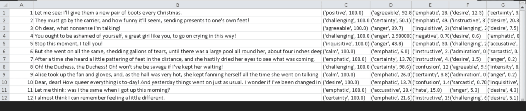 To combat the limitation of potentially only getting classified by the most frequent tones in the training set, I took the highest 3-6 emotional tone probabilities, and normalized them to become more like percentages by reducing the variance between the class values, assuming that if a tone was in the top 5-6 classes found, there was some decent percentage of that tone detected in the text.