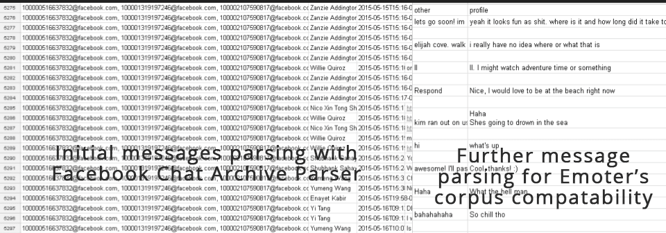 Finally, while developing Emoter, I became more fascinated with the idea of automatically generating digital personalities of individual people, specifically given their archived data on social media (inspired by Black Mirror's episode Be Right Back. I developed an algorithm to parse 70,000 of my Facebook messages (downloaded from their official service), to create a database Emoter could use that was specifically mined from my words. This project was deployed as an interactive exhibit in a gallery.
