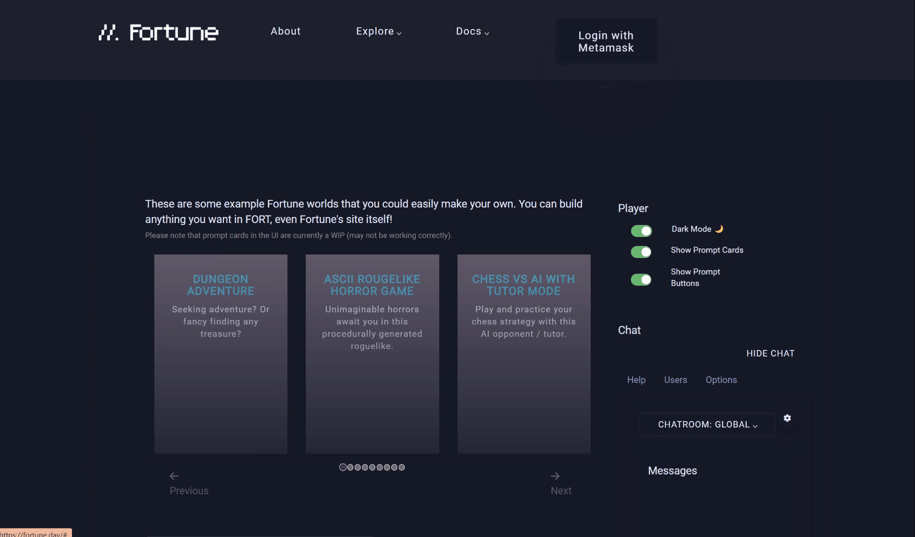 Any type of interaction can be abstracted through the textual mechanics of Fortune's metaverse worlds. Creators can define different prompts with actions that can load new contents to render, give and remove items in the player's inventory, and transfer them to new rooms and worlds. These prompts can be hidden away from the user or shown as buttons or carousel card components. Prompts can also have item requirements, and be hidden and revealed once a player reaches those requirements.