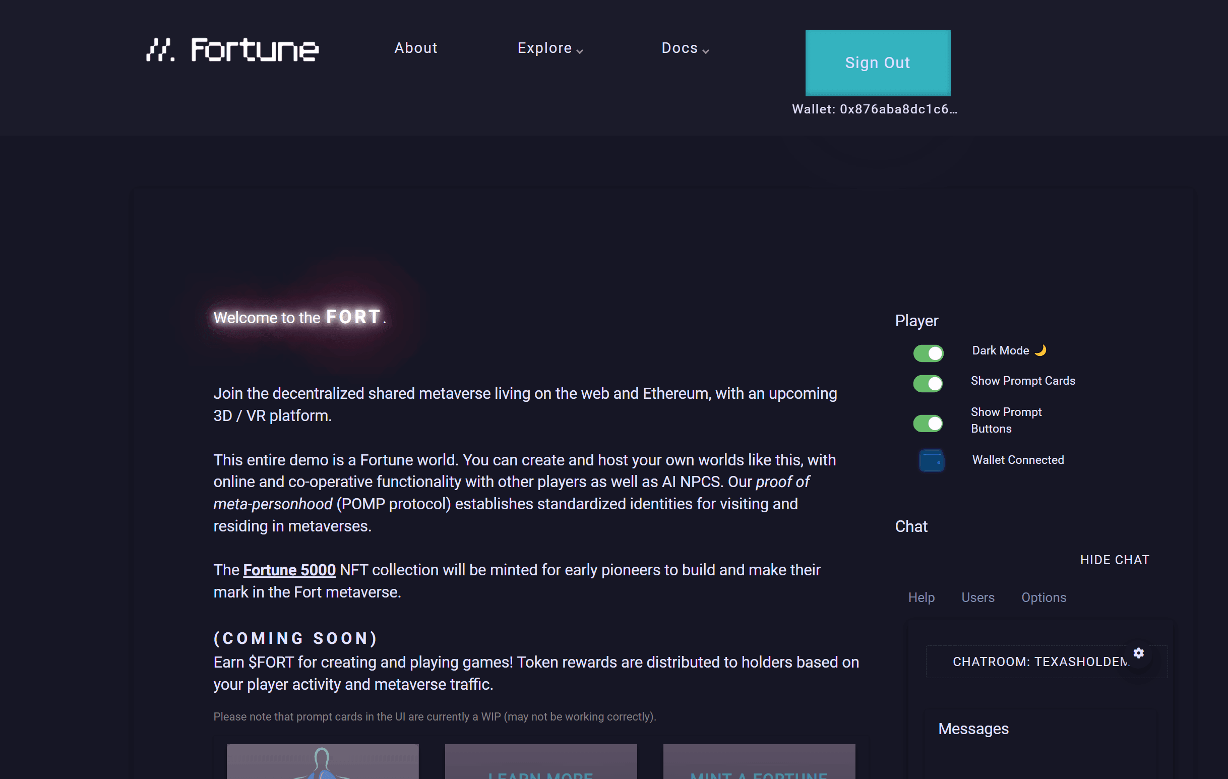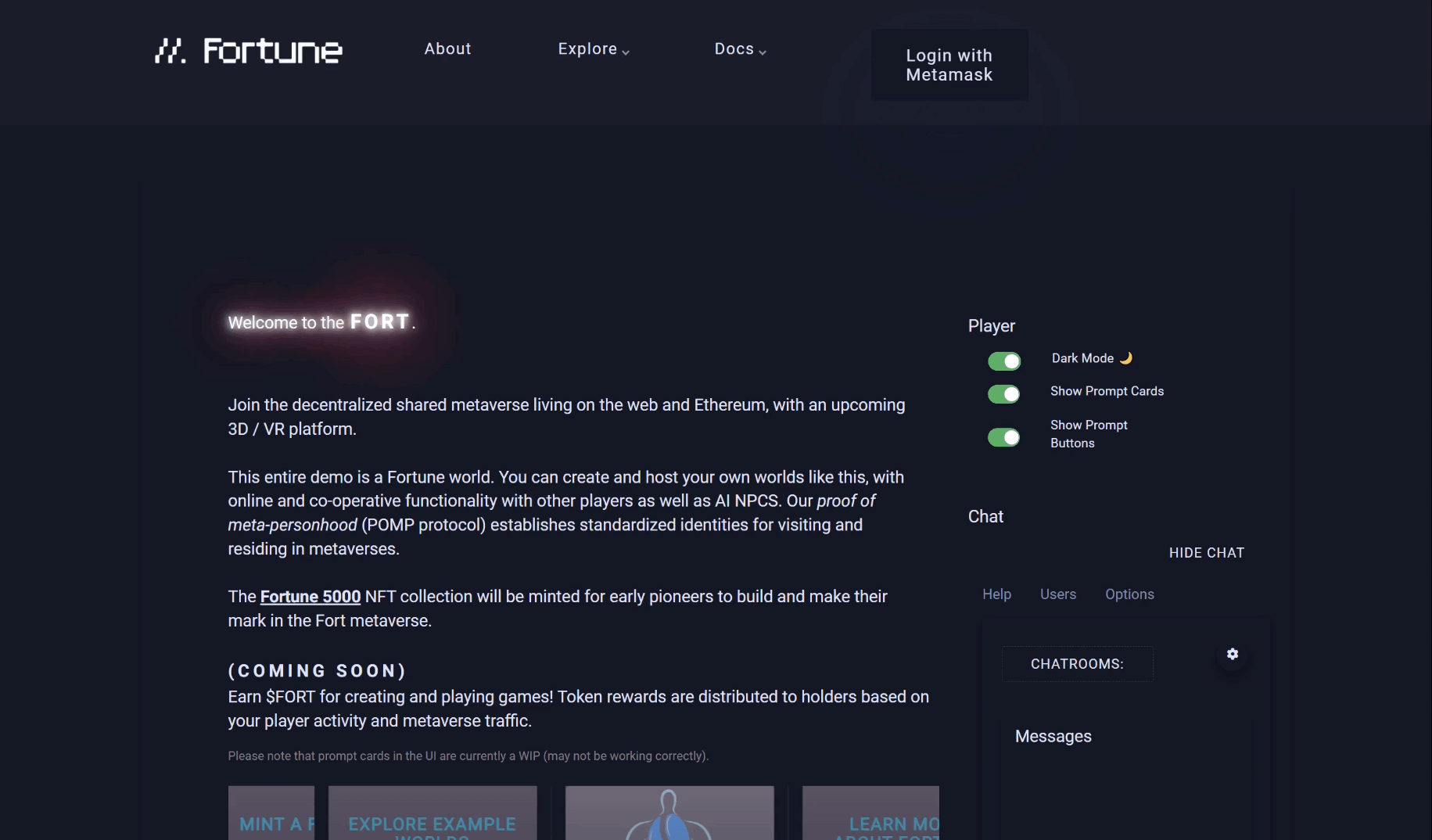 Fortune is a metaverse engine system that links interconnected experiences on the web (as worlds or rooms, which can have subrooms in a recursive data structure), with shared player profiles and inventory states.