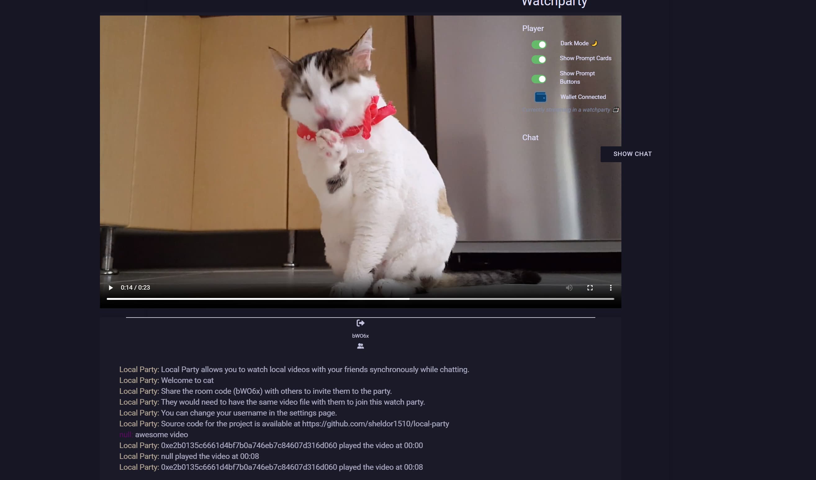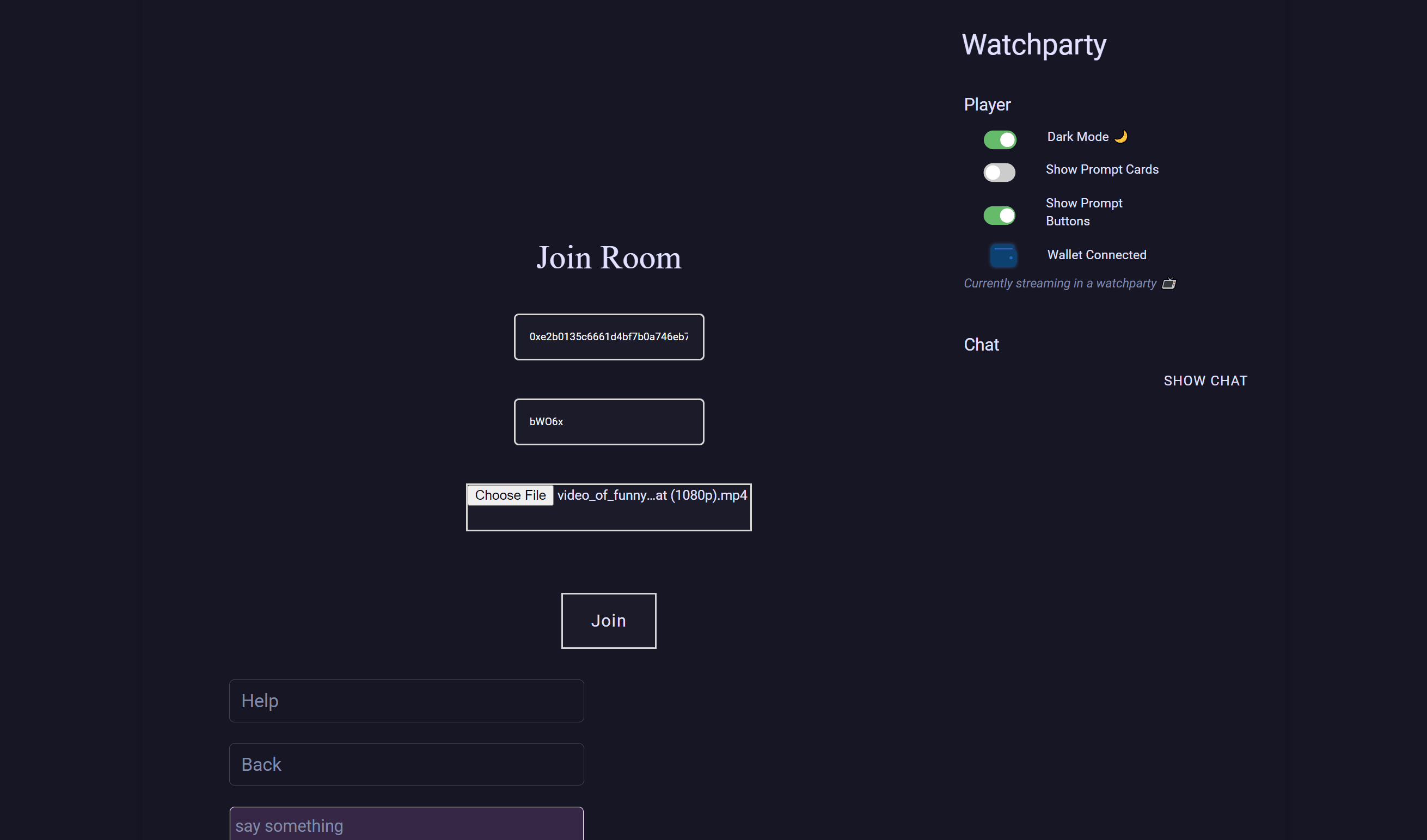 Watchparty room joined with two players watching something simultaneously; each player can move and pause the video on their end and it will change the playback for everyone.