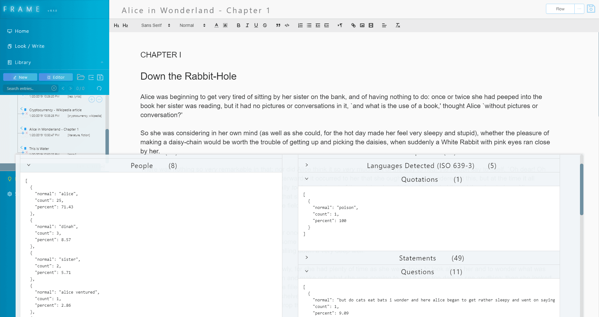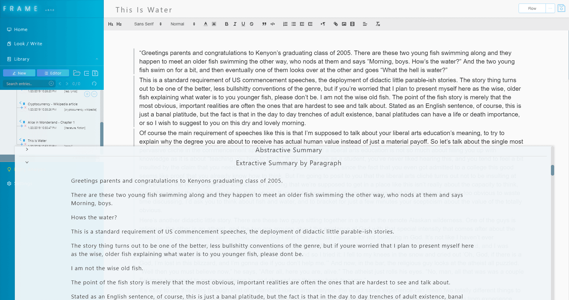 Frame can currently summarize entries by entire documents and by paragraphs, and offers abstractified versions as well. Frame can also answer questions about its entries and provide contextual answers, and can extract and display lists of key information, as well as display data visualizations and track other metrics. Frame's eventual goal is to have a full-fledged voice-operated system that can talk back and listen to the user, and be able to search and navigate the library of entries for advanced analysis and information retrieval.