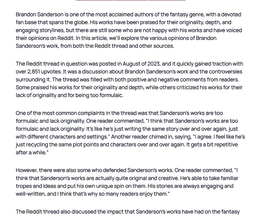 Example article written about Brandon Sanderson and his works, unedited from what the AI wrote, based on a trending Reddit thread discussion on literature.