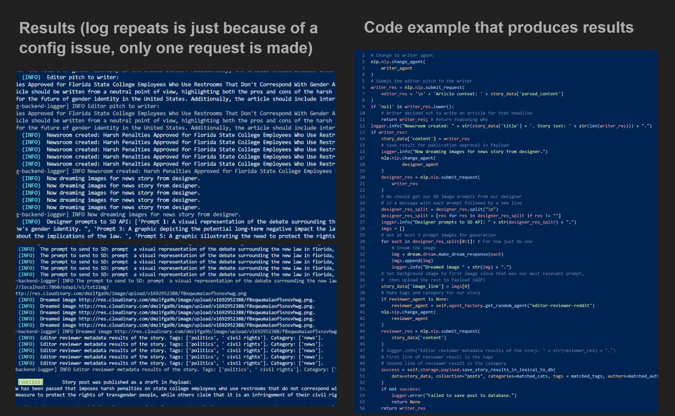 An admin dashboard allows any human staff to easily edit or write new content. All content is passed through human journalists to revise and add more content to, but can be published automatically by AI. Staff can pitch articles via CLI / API to collaboratively write a story with an AI agent.