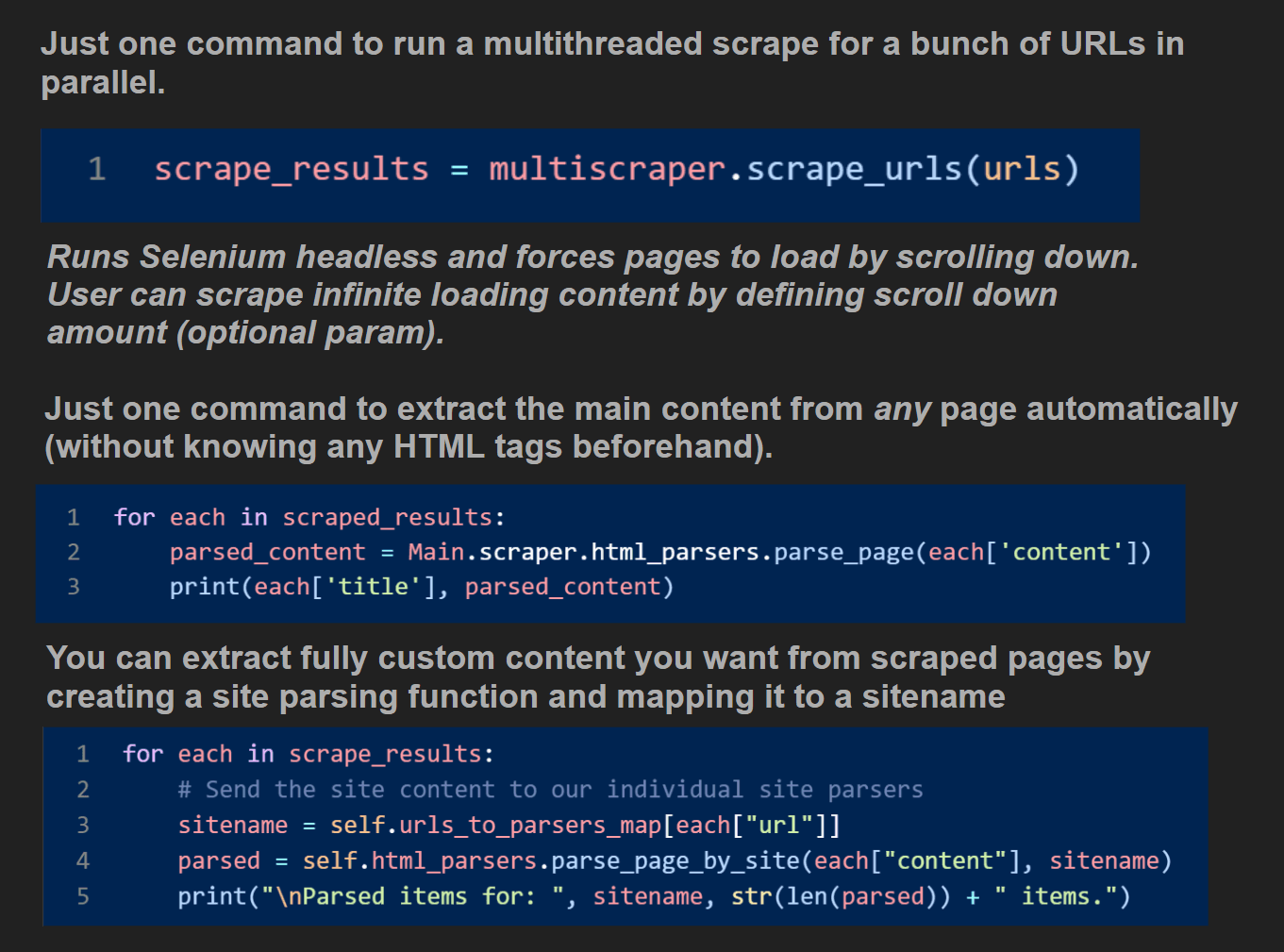 The scraping and NLP APIs written for Hype are straightforward and abstracts away complexity.