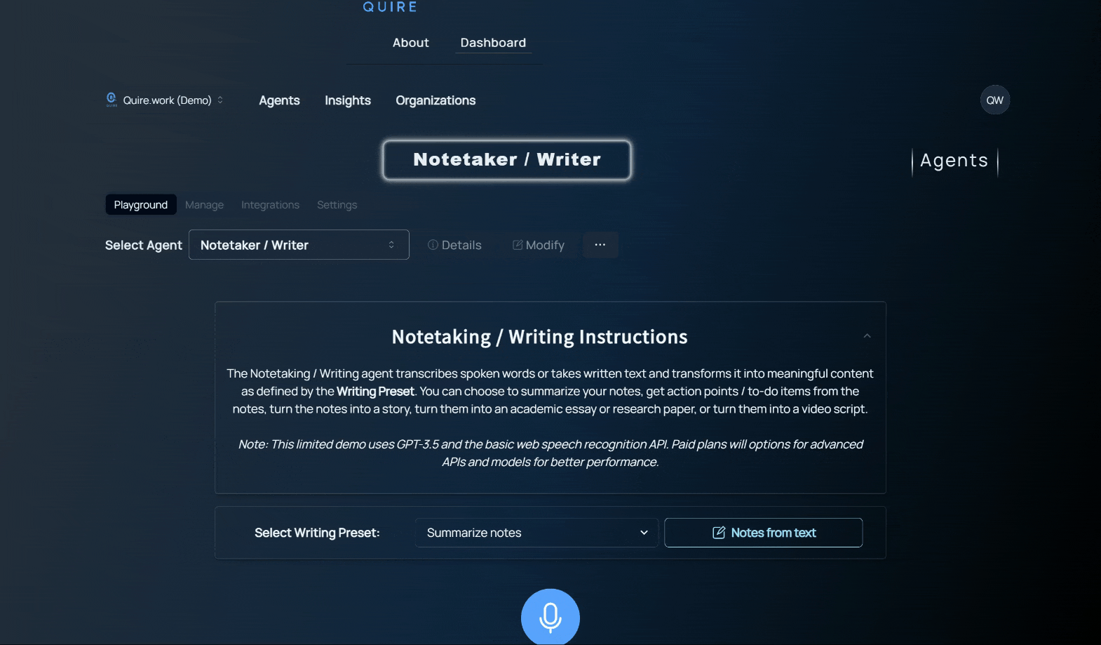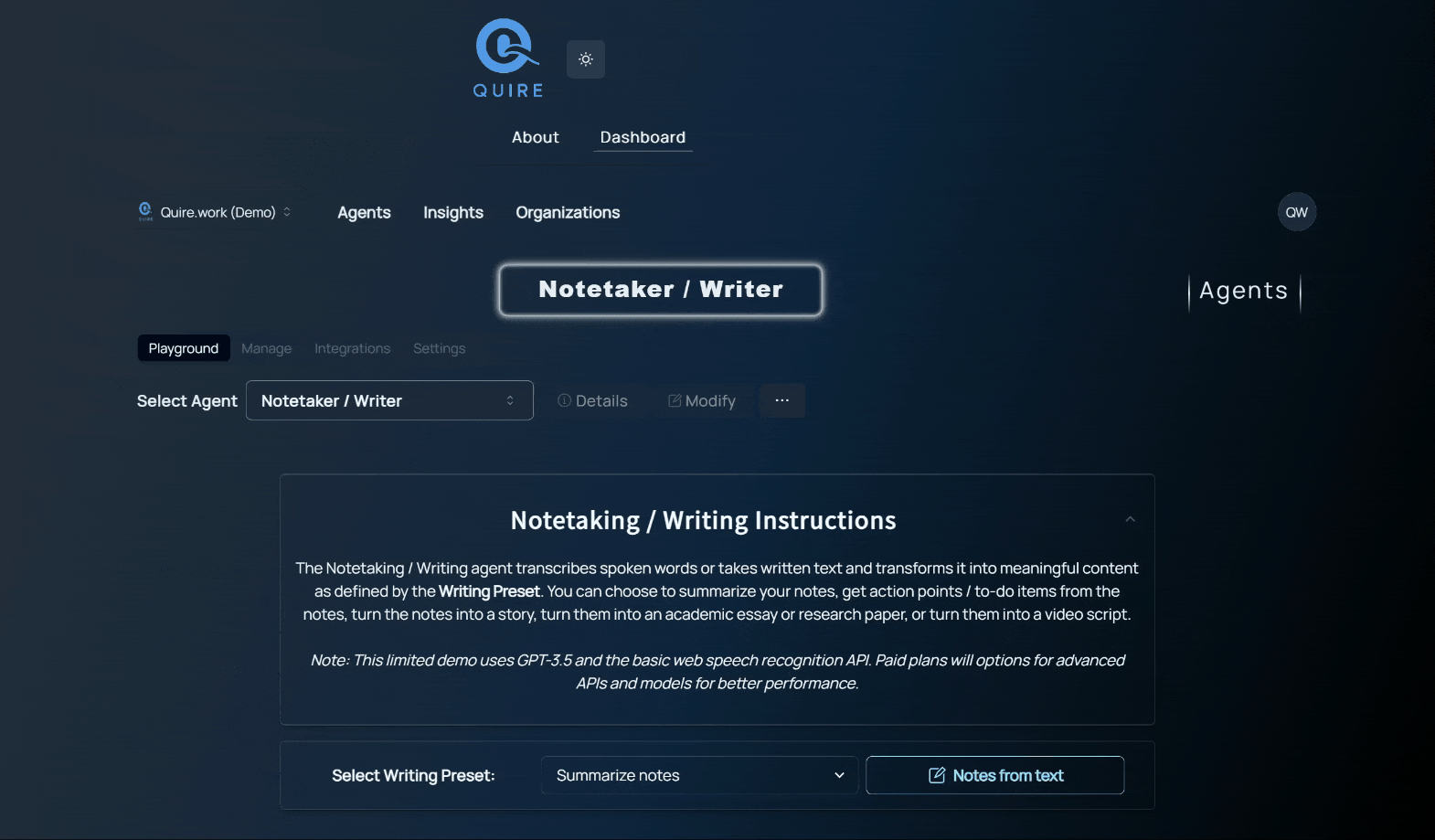 Quire's virtual assistants / agents can do a multitude of features, including SEO content writing, conducting interviews for market research, note-taking and summarization, tutoring with course and study guide creation, and live real-time fact-checking and question answering.