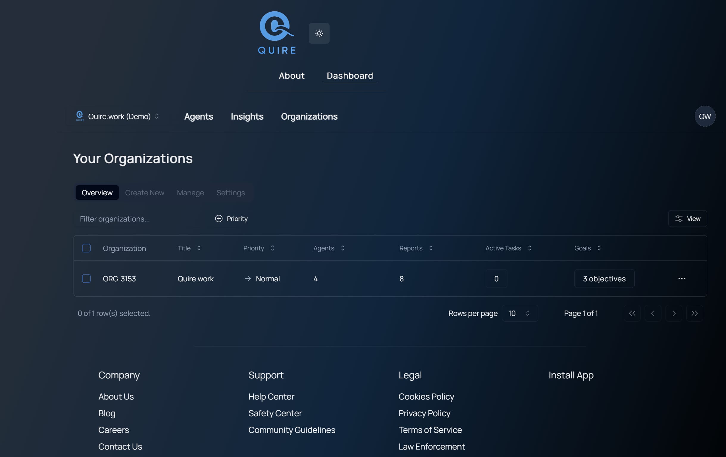 Quire has a dashboard to manage organizations, which house team members and AI agents, who work together collaboratively for a common goal. Each organization has its own AI project manager to keep agents and team members on-track with tasks and deadlines.