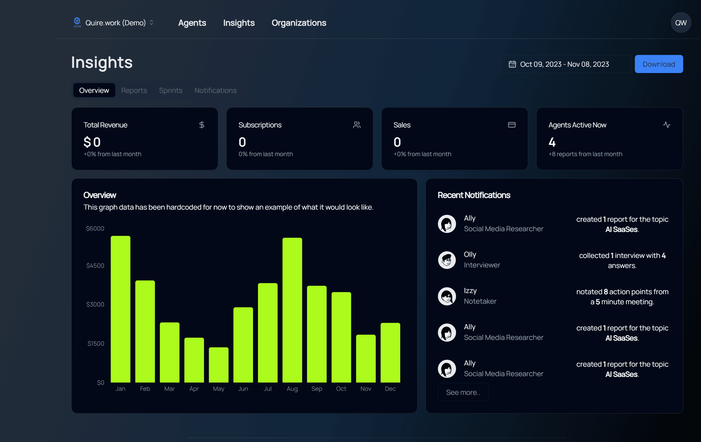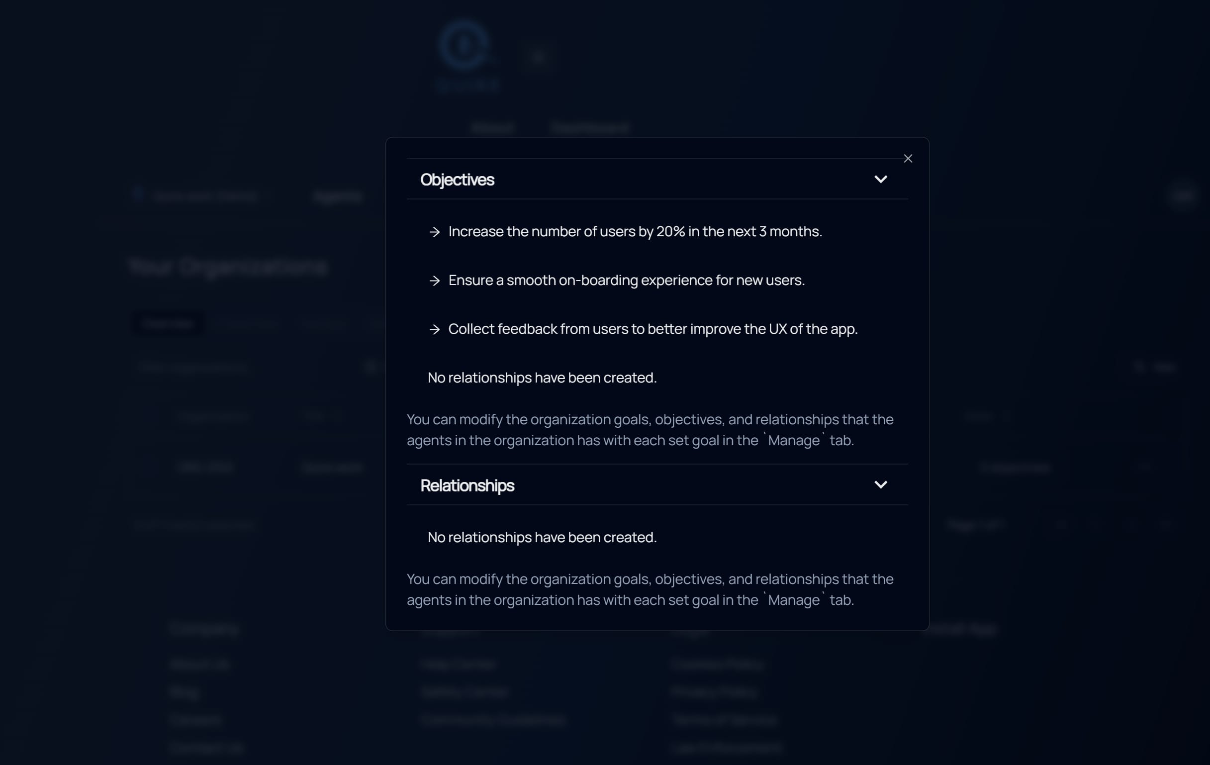 Quire agents within an organization have relationships that can be defined to customize how they orient and act toward the goals of the organization. Agents work together collaboratively to achieve organization objects that are user-defined or defined by the AI project manager.