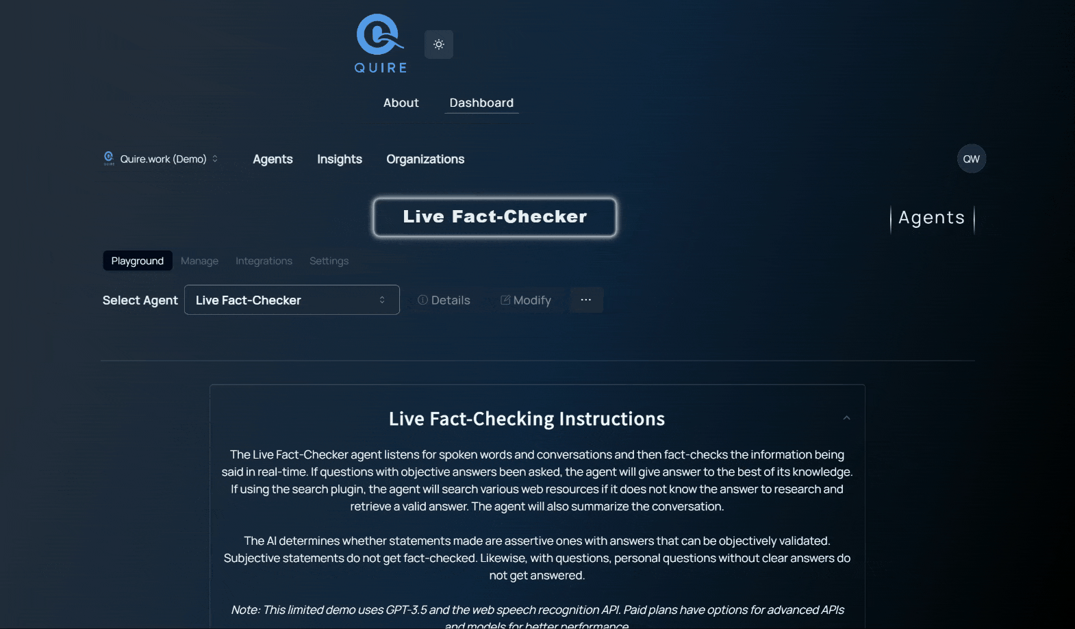 Quire can transcribe and listen to conversations / meetings and perform fact-checking in real-time. Quire detects whether a statement has been made that is an assertion with a verifiable answer, and if it is, it fact-checks it and outputs whether or not the statement made was correct or not, along with some context as to why.