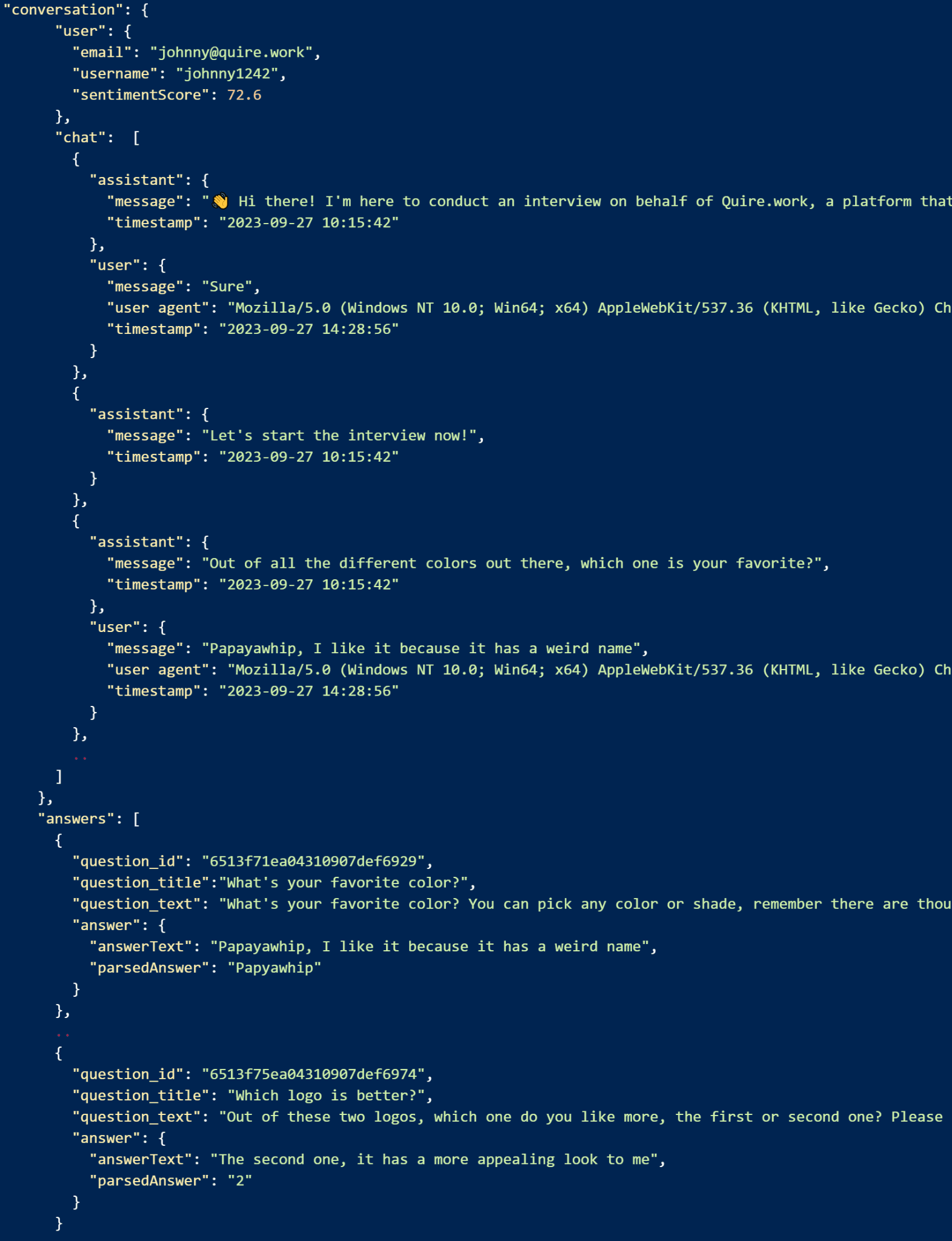 Interviews / conversations can be exported in JSON or CSV, and are saved in the Insights dashboard. This way, market and user research can be easily conducted on a mass scale with automation.