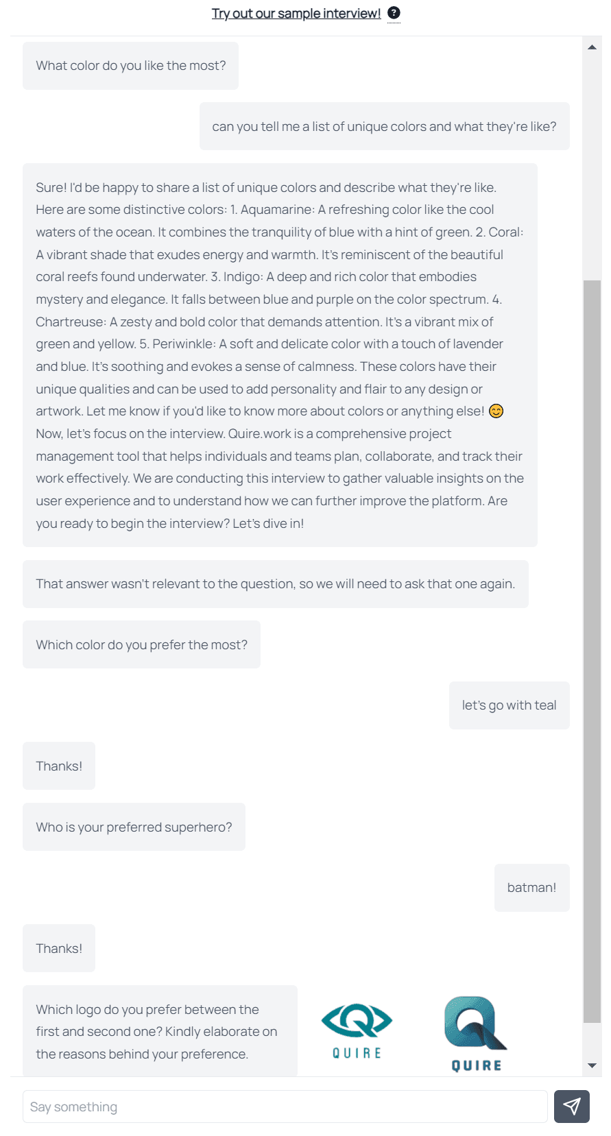 Quire turns static forms and survey questions into automatic rich conversational experiences, can keep track of the flow of questions throughout the interview, while answering questions and conversing naturally with the user.