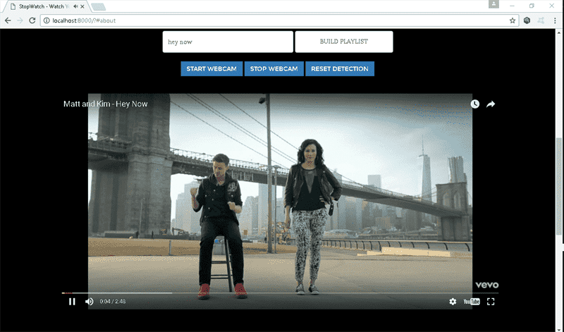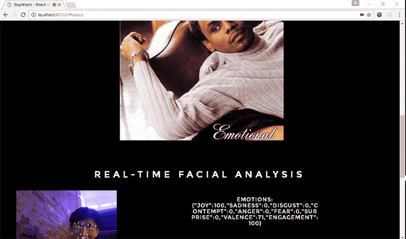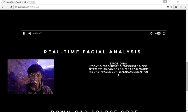 StopWatch is a web app that automatically goes through curated content from YouTube based off of the emotional states detected in the viewer by the webcam, utilizing the Affectiva SDK. Made with Bootstrap and jQuery. I created Stopwatch for a weekend hackathon project, with a prompt based around incorporating 'search' with 'video.'